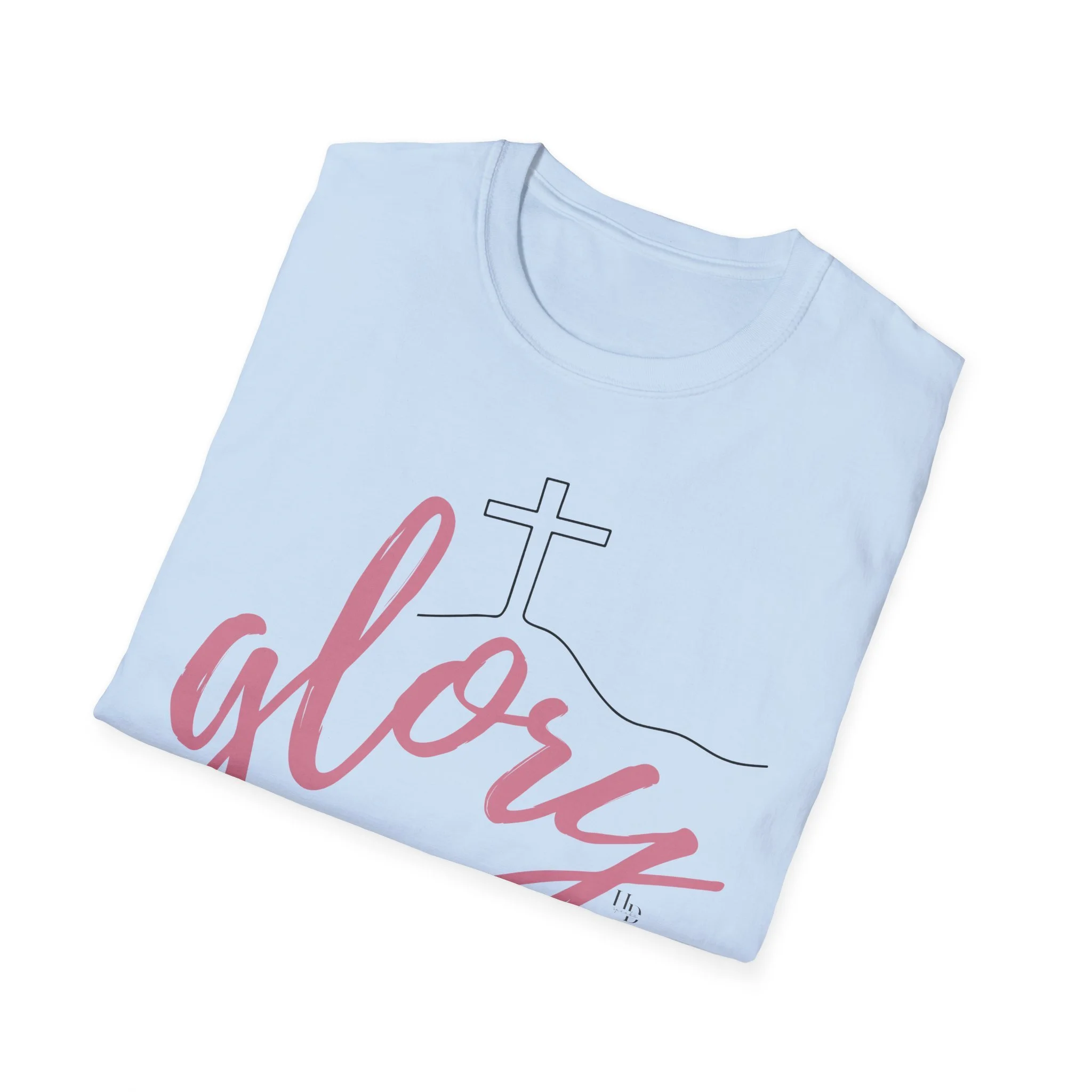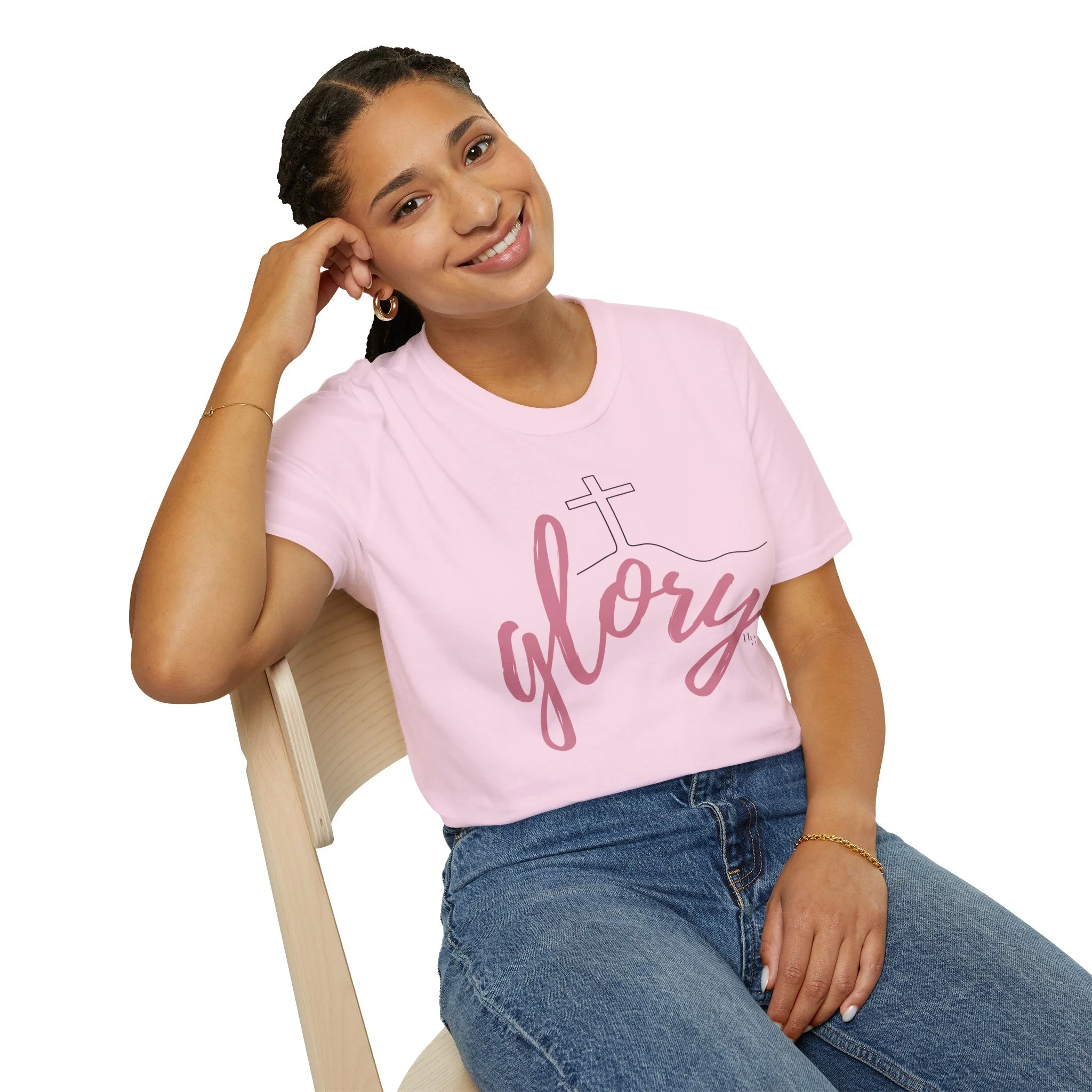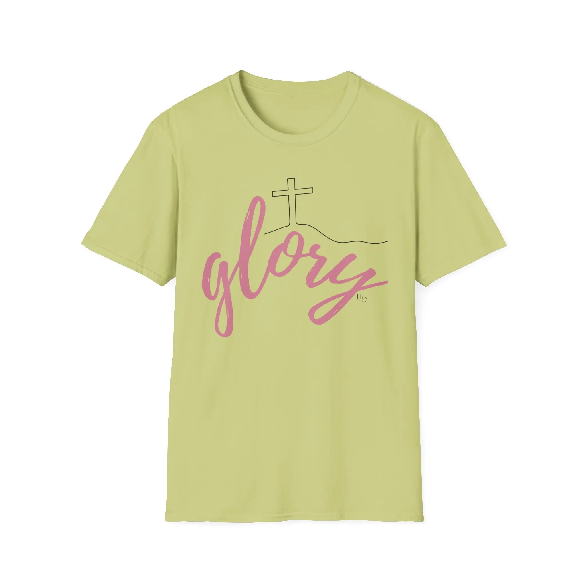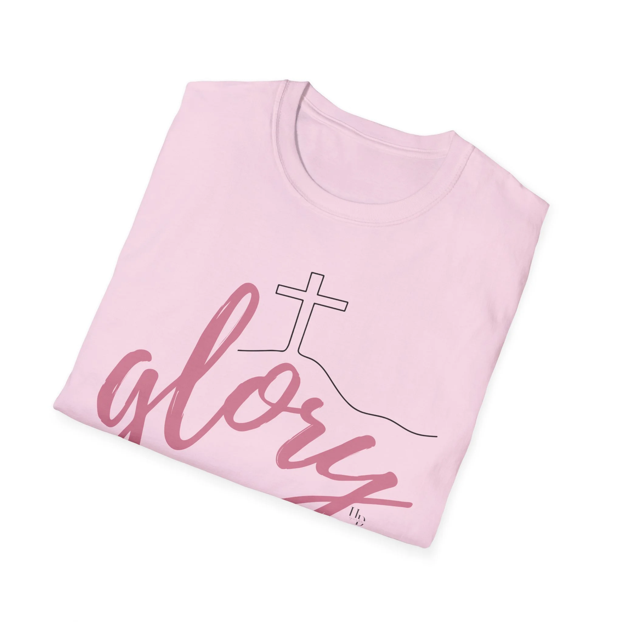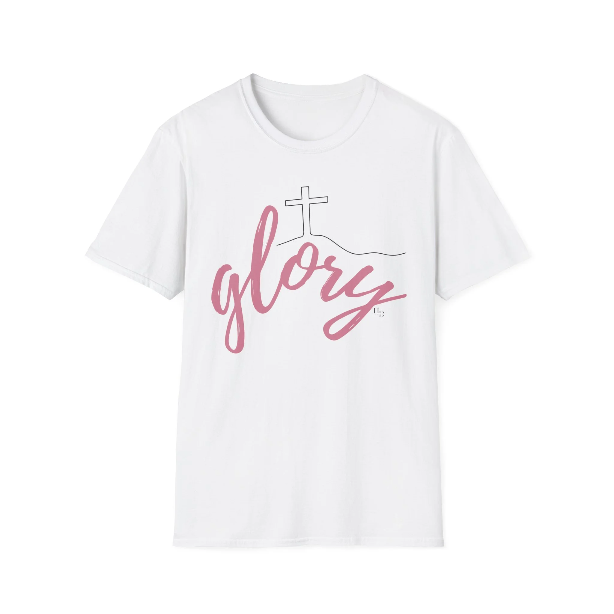 This lightweight cotton tee carries a quiet, faithful energy. A soft, hand-lettered “glory” sweeps across the chest in warm rose tones, capped by a simple cross that keeps the message gentle and grounded. The crew neckline and classic fit let the design speak without fuss — wear it layered with a cardigan for Sunday gatherings or alone on errands when you want a subtle reminder of hope. It’s breathable, smooth against the skin, and made to move with you through everyday moments of gratitude and worship.