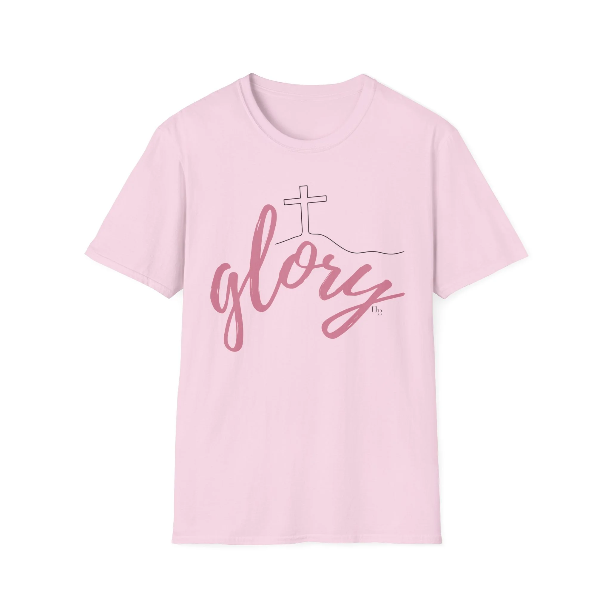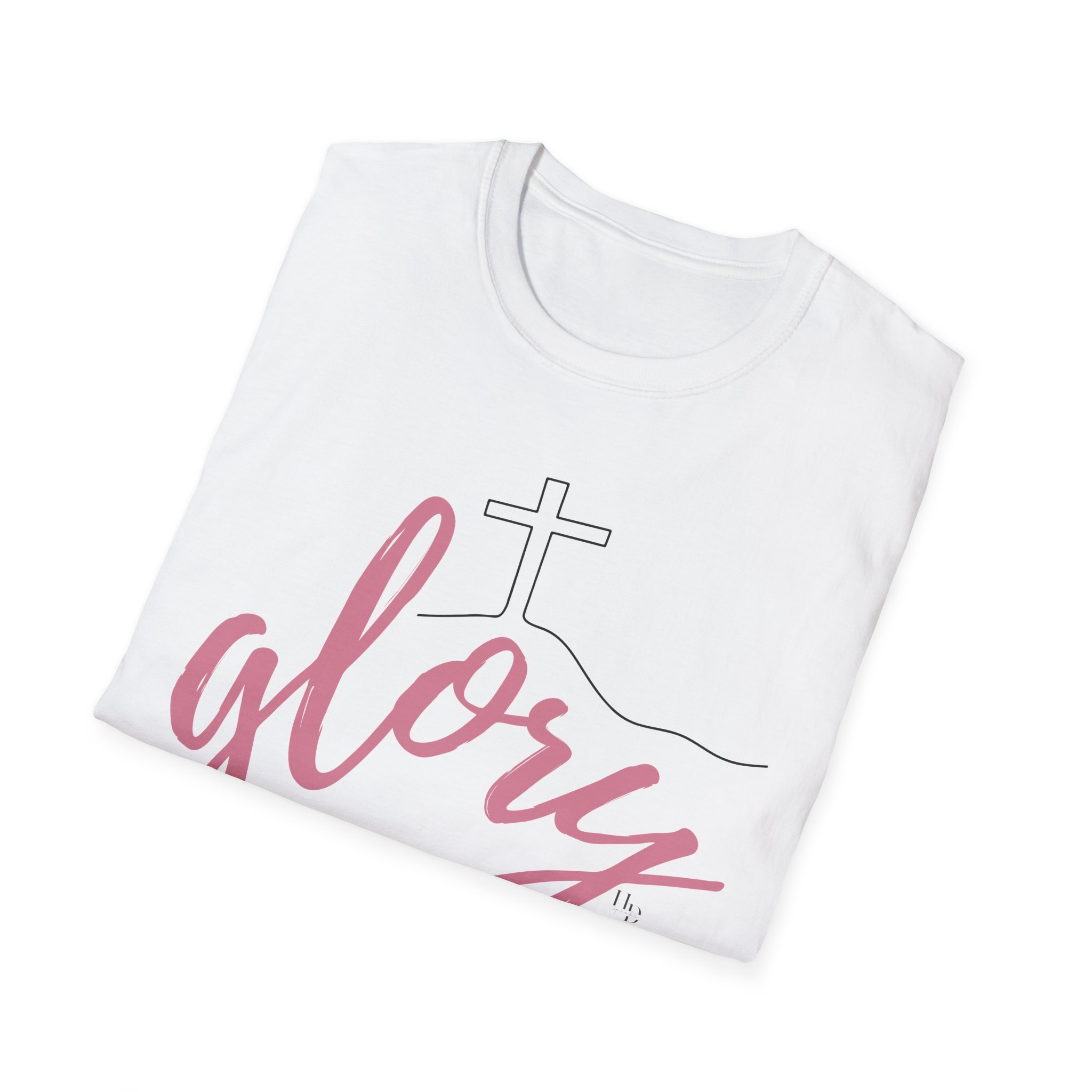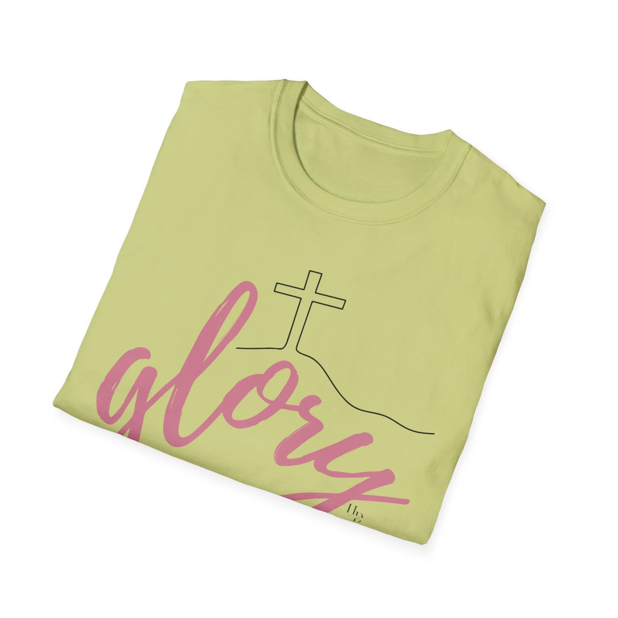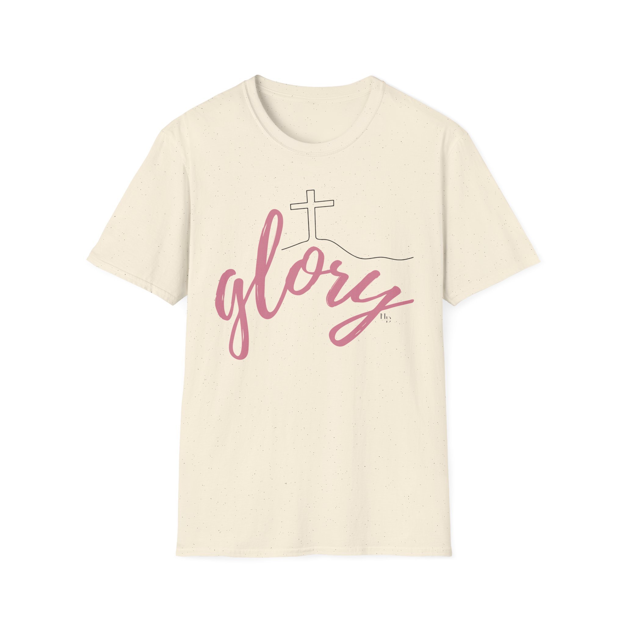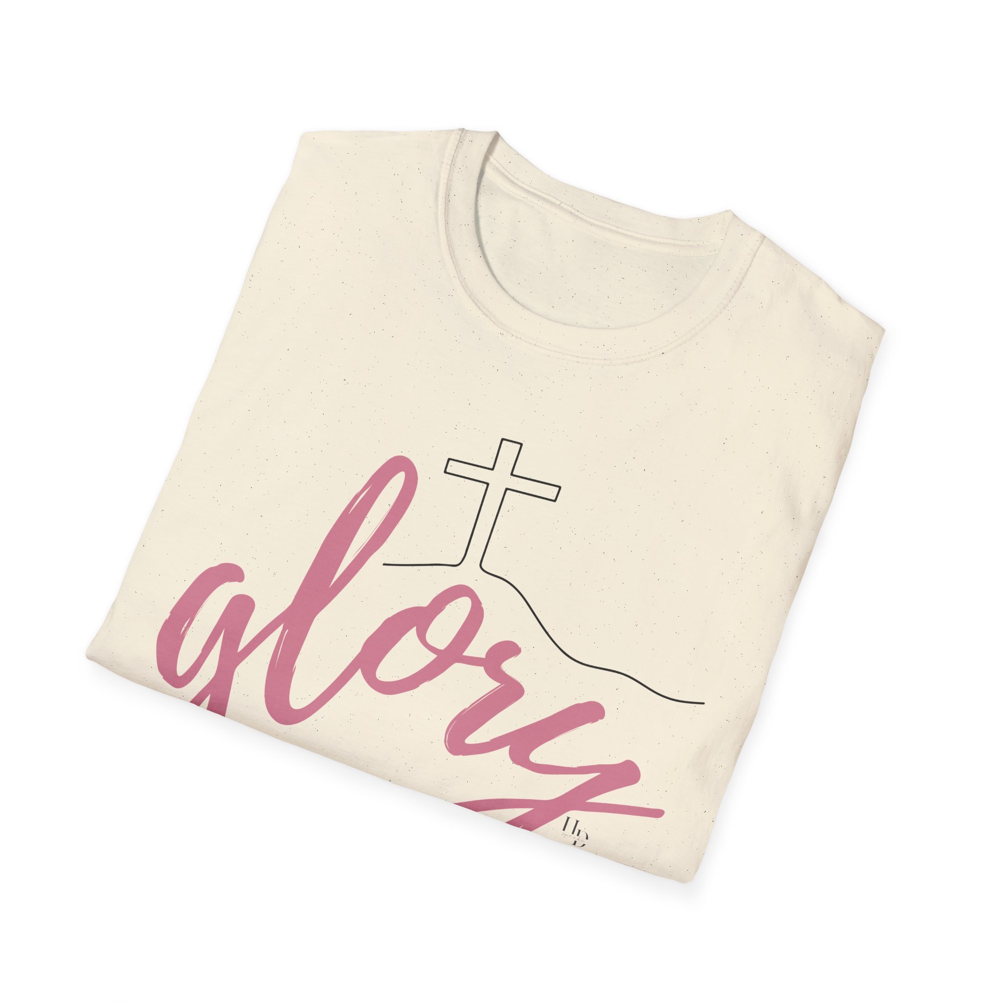 This lightweight cotton tee carries a quiet, faithful energy. A soft, hand-lettered “glory” sweeps across the chest in warm rose tones, capped by a simple cross that keeps the message gentle and grounded. The crew neckline and classic fit let the design speak without fuss — wear it layered with a cardigan for Sunday gatherings or alone on errands when you want a subtle reminder of hope. It’s breathable, smooth against the skin, and made to move with you through everyday moments of gratitude and worship.